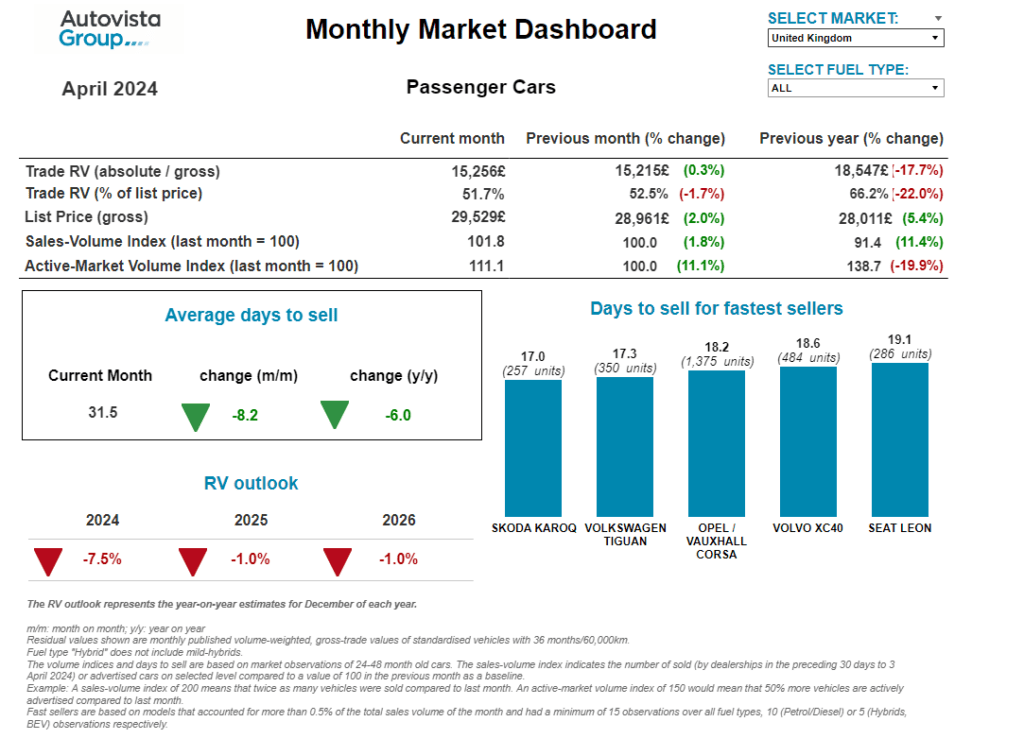 The interactive monthly market dashboard examines passenger-car data by fuel type, for Austria, Germany, Italy, Spain, Switzerland, and the UK. It includes a breakdown of key performance indicators, including RVs, new-car list prices, selling days, sales volume and active-market volume indices.
