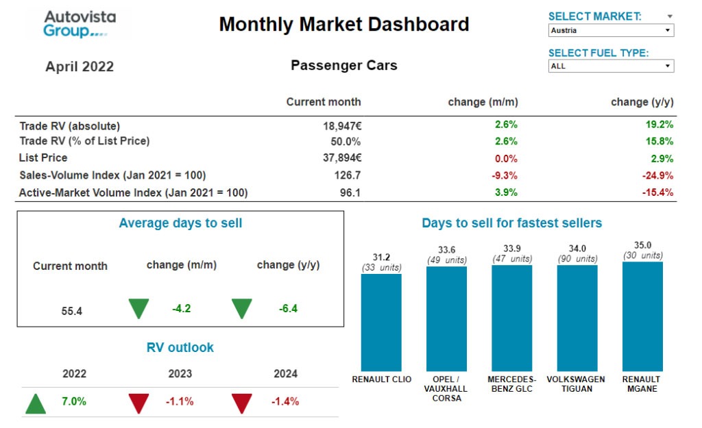 Autovista Group’s used-car coverage in the monthly market dashboard features Austria, France, Germany, Italy, Spain, Switzerland, and the UK. It also includes a breakdown of key performance indicators by fuel type, average new-car list prices, as well as sales-volume and active market-volume indices.