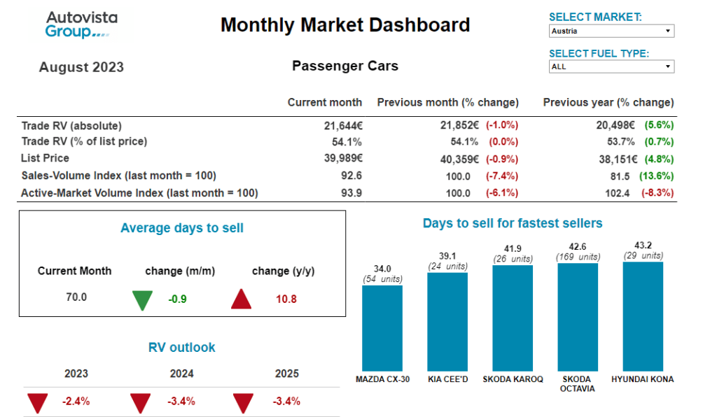 The interactive monthly market dashboard examines Austria, France, Germany, Italy, Spain, Switzerland, and the UK. It includes a breakdown of key performance indicators by fuel type, including RVs, new-car list prices, selling days, sales volume and active-market volume indices.