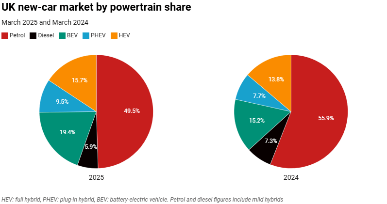 The performance was the best of the year for the powertrain, following double-digit losses in January and February. It meant that petrol accounted for 49.5% of the market, although this was a drop of 6.4pp compared to March 2024.